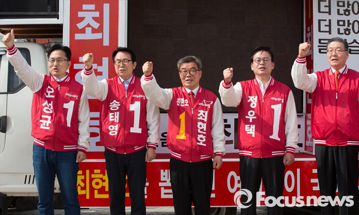 (청주=포커스뉴스) 20대 국회의원 선거유세가 시작된 31일 오전 충북 청주시 사직동 분수대 앞에서 청주 새누리당 후보자들이 출정식을 갖고 필을을 다짐하고 있다.