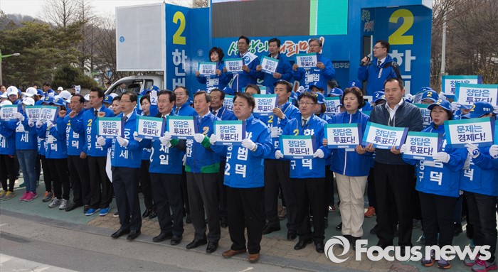 (청주=포커스뉴스) 20대 국회의원 선거유세가 시작된 31일 오전 충북 청주시 상당공원사거리에서 청주시 더불어민주당 국회의원 후보자들이 출정식을 갖고 필승을 다짐하고 있다.