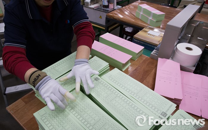 (파주=포커스뉴스) 제20대 총선 선거운동이 공식적으로 시작된 31일 오전 경기도 파주 한 인쇄소에서 직원이 투표용지를 인쇄해 분류작업을 하고 있다.