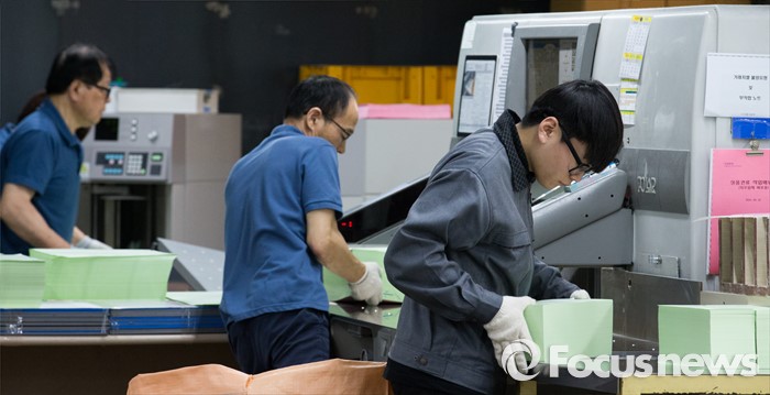 (파주=포커스뉴스) 제20대 총선 선거운동이 공식적으로 시작된 31일 오전 경기도 파주 한 인쇄소에서 직원들이 투표용지를 인쇄해 분류작업을 하고 있다.