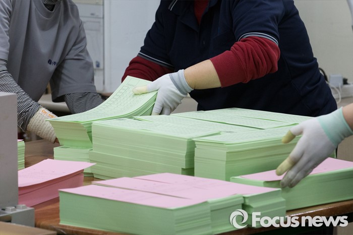 (파주=포커스뉴스) 제20대 총선 선거운동이 공식적으로 시작된 31일 오전 경기도 파주 한 인쇄소에서 직원들이 투표용지를 인쇄해 분류작업을 하고 있다.