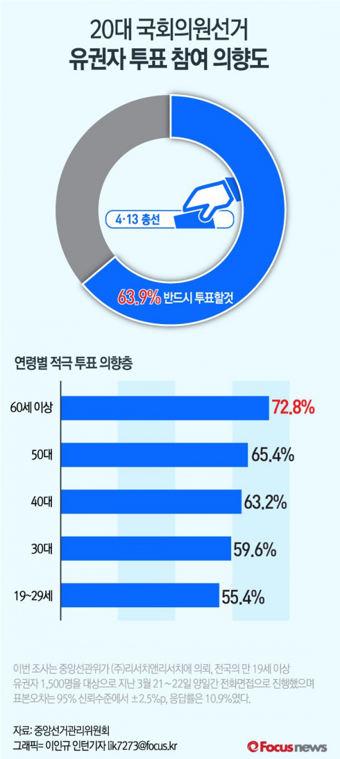 (서울=포커스뉴스) 중앙선거관리위원회는 30일 "제20대 국회의원 선거와 관련, 유권자를 대상으로 실시한 투표참여 의향 및 사전투표제도 인지도 등에 관한 여론조사를 진행한 결과 63.9%가 '반드시 투표할 것'이라고 응답했다"고 밝혔다.