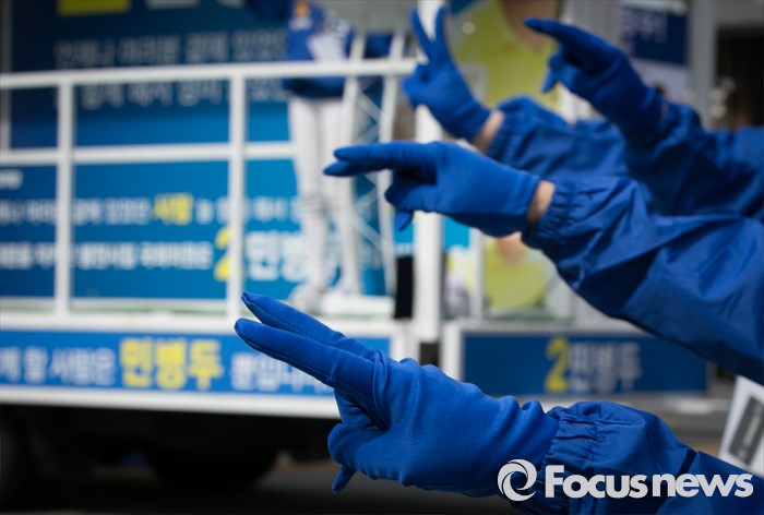 (서울=포커스뉴스) 20대 총선 공식선거 운동이 시작된 31일 오전 서울 장안동사거리에서 민병두 더불어민주당 동대문을 후보 선거운동원들이 지지를 호소하고 있다.