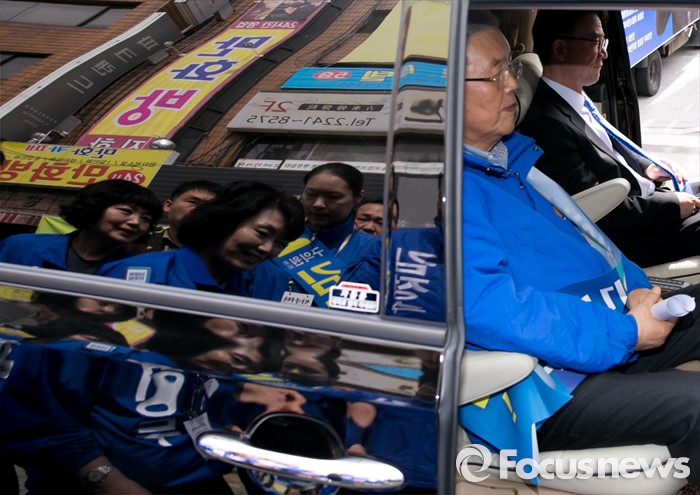 (서울=포커스뉴스) 20대 총선 공식선거 운동이 시작된 31일 오전 서울 장안동사거리에서 민병두 더불어민주당 동대문을 후보 유세를 마친 김종인 비대위 대표 겸 선대위원장이 차량에 올라 이동하고 있다.