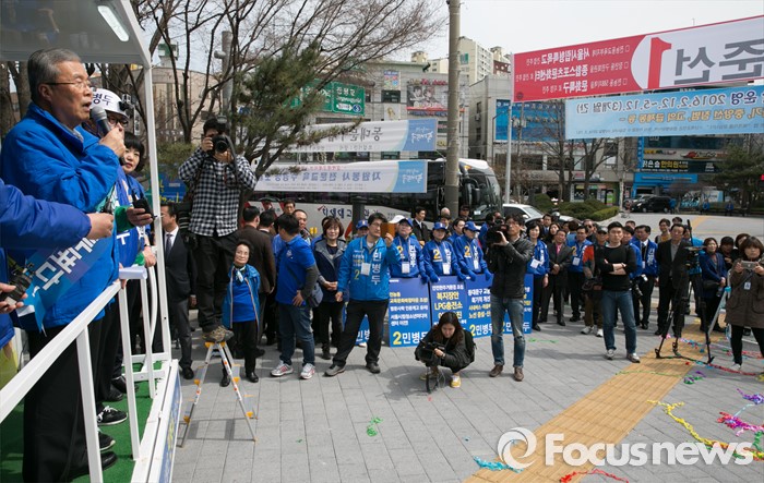 (서울=포커스뉴스) 20대 총선 공식선거 운동이 시작된 31일 오전 서울 장안동사거리에서 열린 민병두 더불어민주당 동대문을 후보 출정식에 참석한 김종인 비대위 대표 겸 선대위원장이 지지를 호소하고 있다.