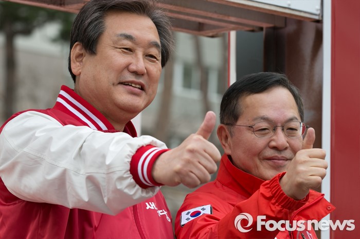 (서울=포커스뉴스) 4.13 총선 공식선거운동이 시작된 31일 오전 서울 마포구 아현시장에서 김무성(왼쪽) 새누리당 대표와 안대희 마포갑 후보가 엄지를 치켜들고 있다.