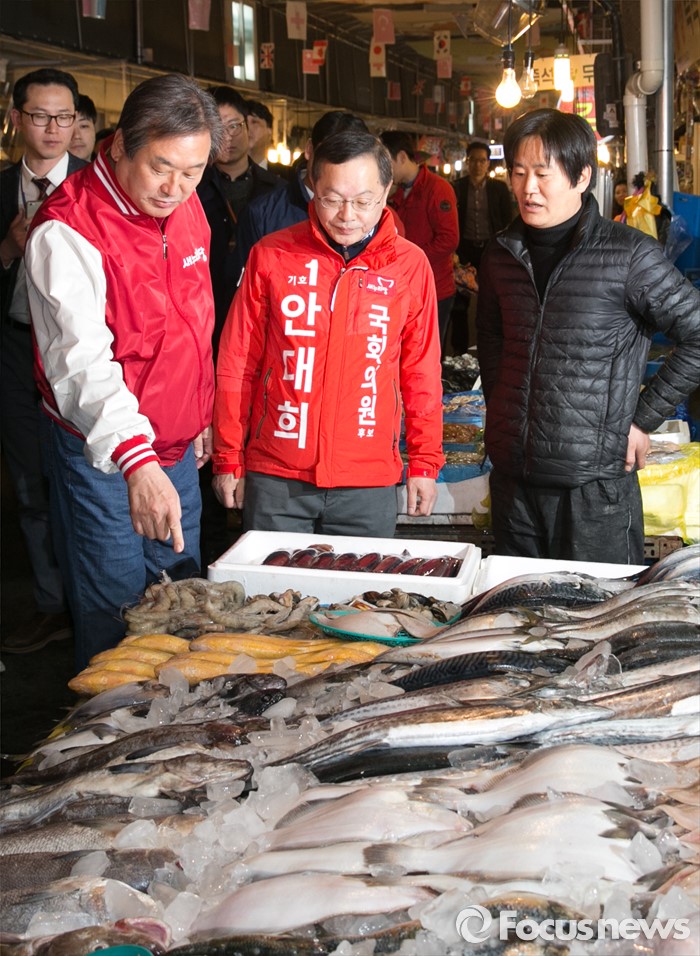 (서울=포커스뉴스) 4.13 총선 공식선거운동이 시작된 31일 오전 서울 마포구 아현시장에서 김무성(왼쪽) 새누리당 대표와 안대희(가운데) 마포갑 후보가 생선을 보며 상인과 대화하고 있다.