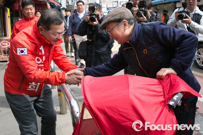 (서울=포커스뉴스) 4.13 총선 공식선거운동이 시작된 31일 오전 서울 마포구 아현시장에서 안대희 새누리당 마포갑 후보가 시민들과 인사하고 있다.