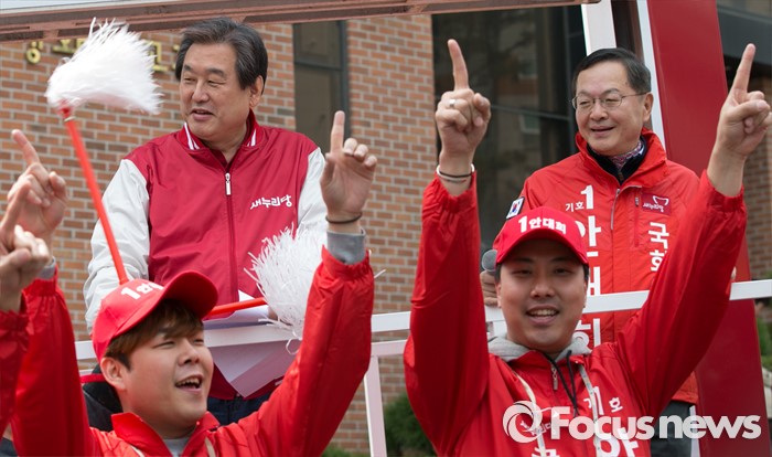 (서울=포커스뉴스) 4.13 총선 공식선거운동이 시작된 31일 오전 서울 마포구 아현시장에서 김무성(왼쪽) 새누리당 대표가 안대희 마포갑 후보와 함께 유세 차량에 올라, 선거운동을 지켜보고 있다.