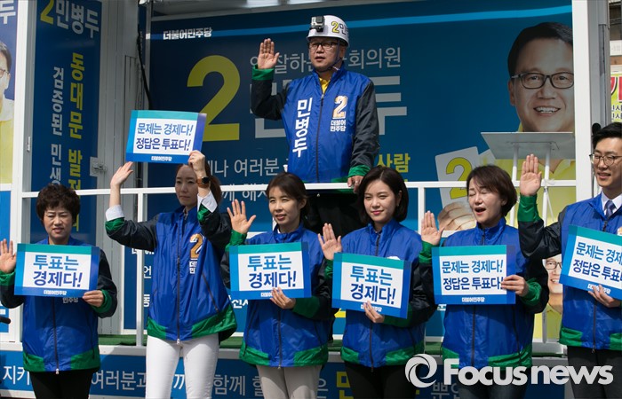 (서울=포커스뉴스) 20대 총선 공식선거 운동이 시작된 31일 오전 서울 장안동사거리에서 민병두 더불어민주당 동대문을 후보와 비례대표 후보들이 출정식을 하고 있다.