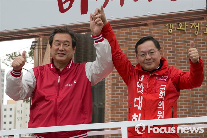 (서울=포커스뉴스) 4.13 총선 공식선거운동이 시작된 31일 오전 서울 마포구 아현시장에서 김무성(왼쪽) 새누리당 대표가 안대희 마포갑 후보와 함께 유세 차량에 올라 포즈를 취하고 있다.
