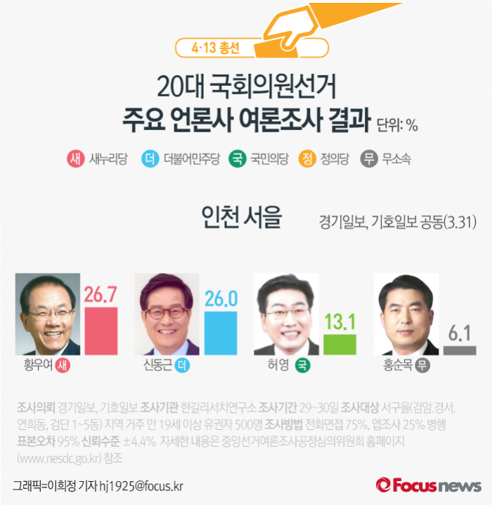 (서울=포커스뉴스) 경기일보와 기호일보가 공동으로 한길리서치연구소에 의뢰해 31일 발표한 여론조사 결과에 따르면 새누리당 황우여 후보의 지지율은 26.7%, 더불어민주당 신동근 후보의 지지율은 26.0%, 국민의당 허영 후보는 13.1%, 무소속 홍순목 후보는 6.1%를 기록했다.