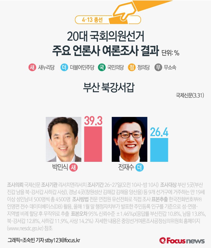 (서울=포커스뉴스) 국제신문이 26~27일(오전 10시~밤 10시)까지 리서치앤리서치에 의뢰해 부산 북강서갑에 거주하는 유권자 500명을 대상으로 여론조사를 한 결과, 새누리당 박민식 후보의 지지율이 39.3%, 더불어민주당 전재수 후보는 26.4%의 지지율을 보인것으로 나타났다.