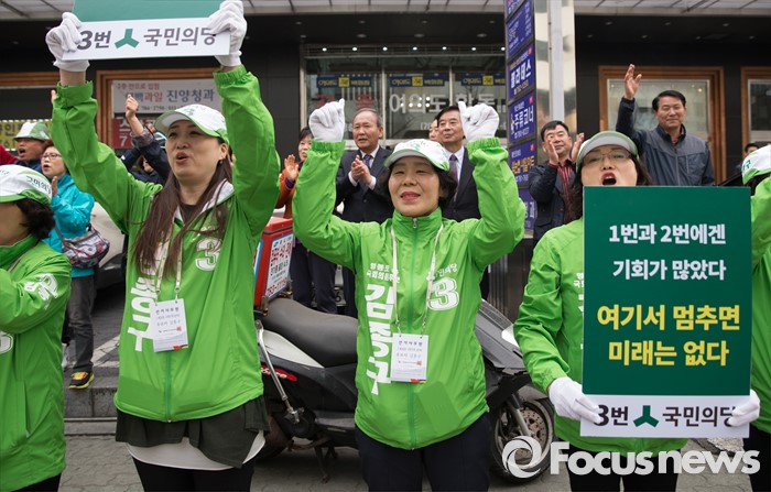 (서울=포커스뉴스) 총선 선거운동이 공식적으로 시작된 31일 오후 서울 영등포구 여의도백화점 앞에서 선거운동 자원봉사자들이 김종구 국민의당 영등포을 후보 지원 유세를 하고 있다.