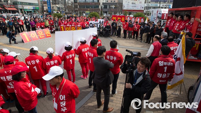 (대전=포커스뉴스) 31일 오후 대전 서대전역광장에서 열린 대전 새누리당 후보자 합동유세에서 후보자들이 지지를 호소하고 있다.