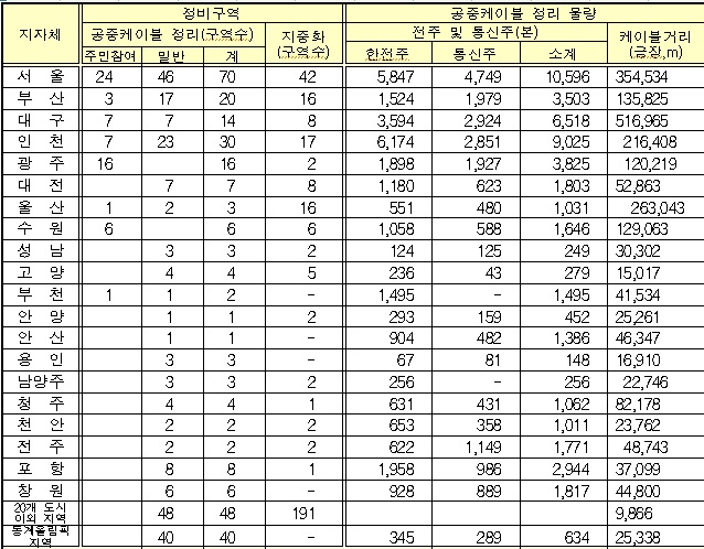 지방자치단체와 정비사업자는 올해 공중케이블 정리사업에 2761억원, 지중화사업에 1391억원 등 총 4151억원을 투자할 계획이다. 이는 지난해 투자금액 3375억원에 비해 776억원이 증가한 것이다.