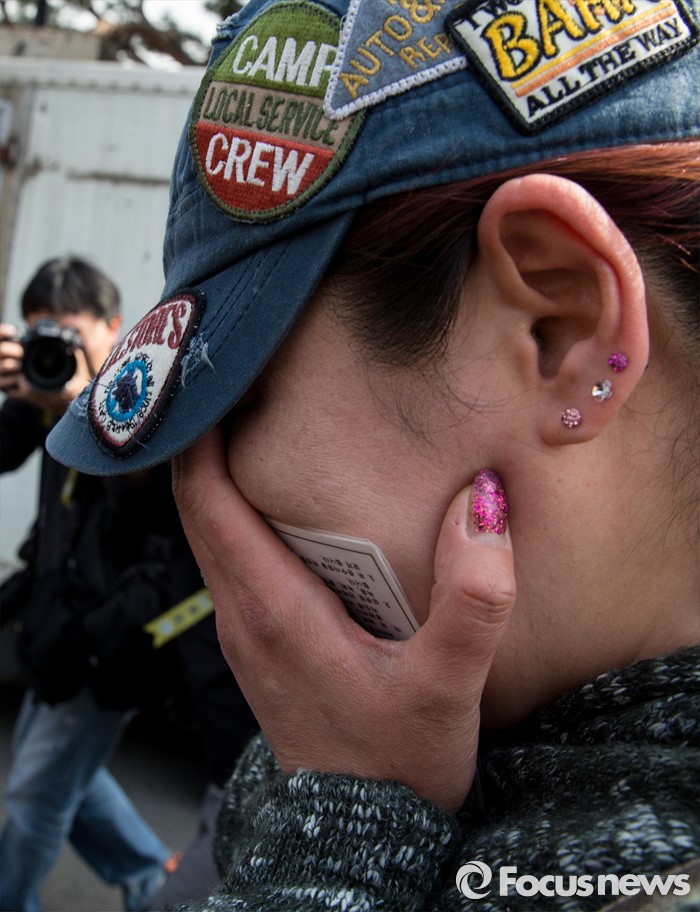 (서울=포커스뉴스) 헌법재판소의 자발적 성매매 처벌 규정 합헌 결정이 내려진 23일 오후 서울 재동 헌법재판소 앞에서 한터 관계자가 기자회견 후 눈물을 흘리고 있다.