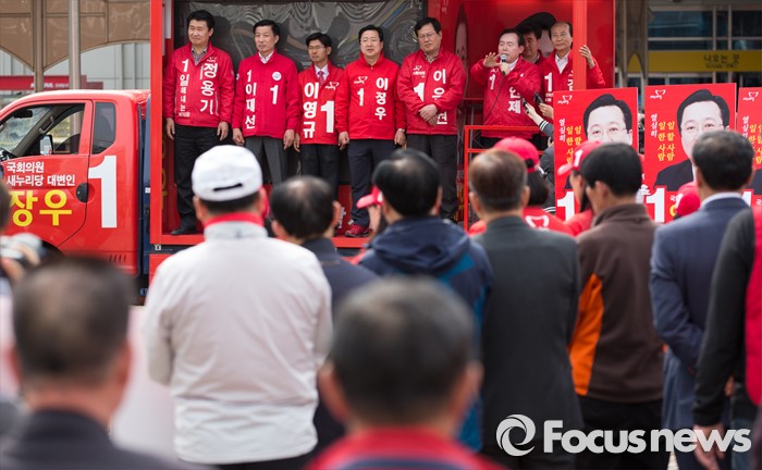 (대전=포커스뉴스) 31일 오후 대전 서대전역광장에서 열린 대전 새누리당 후보자 합동유세에서 이인제 중앙선거대책위원회 공동위원장이 지원유세를 하고 있다.