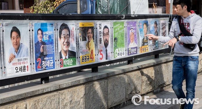 (서울=포커스뉴스) 4·13 총선의 본격적인 선거운동이 시작된 31일 오후 서울 종로구 경복궁역에 부착된 선거벽보 앞을 시민들이 지나가고 있다.