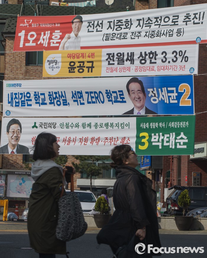 (서울=포커스뉴스) 4·13 총선의 본격적인 선거운동이 시작된 31일 오후 서울 종로구의 한 교차로에 후보들의 현수막이 붙어 있다.