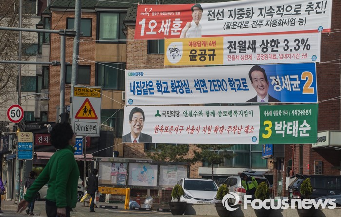 (서울=포커스뉴스) 4·13 총선의 본격적인 선거운동이 시작된 31일 오후 서울 종로구의 한 교차로에 후보들의 현수막이 붙어 있다.