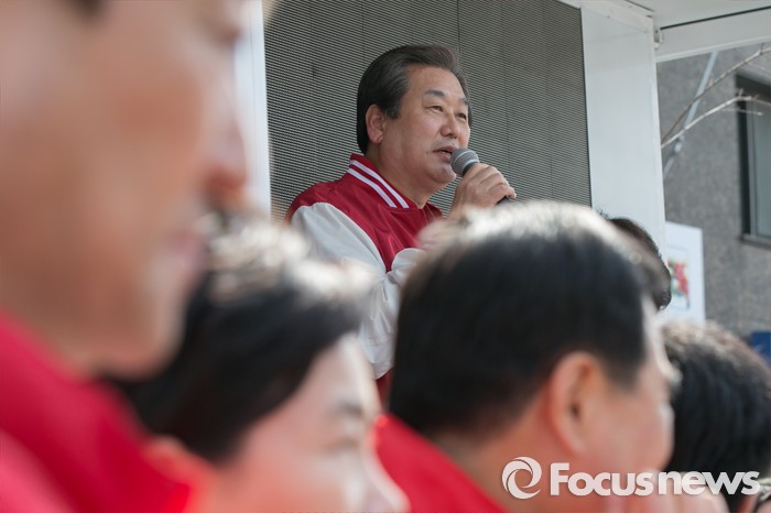 (서울=포커스뉴스) 4.13 총선 공식선거운동이 시작된 31일 오후 서울 용산구 후암시장 앞에서 김무성 새누리당 대표가 황춘자 용산 후보 지원유세를 하고 있다.