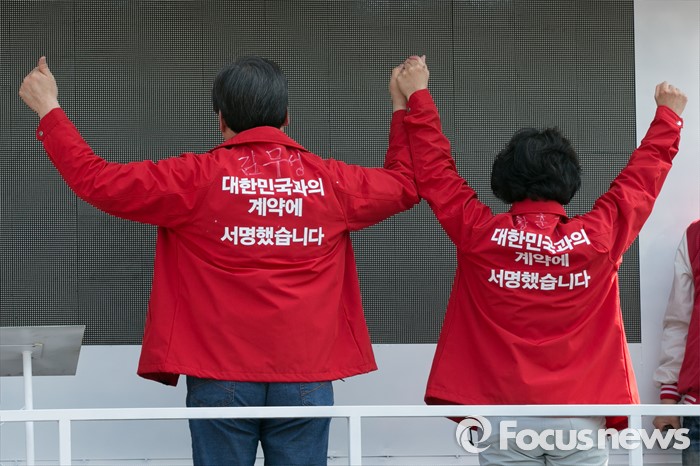 (서울=포커스뉴스) 4.13 총선 공식선거운동이 시작된 31일 오후 서울 용산구 후암시장 앞에서 김무성(왼쪽) 새누리당 대표가 황춘자 용산 후보 지원유세를 하고 있다.