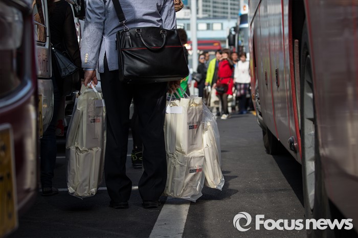 (서울=포커스뉴스) 한국을 방문 중인 중국 아오란 그룹 임직원 6000여 명이 31일 오후 서울 용산구의 한 면세점을 찾아 쇼핑한 뒤 버스에 탑승하고 있다.