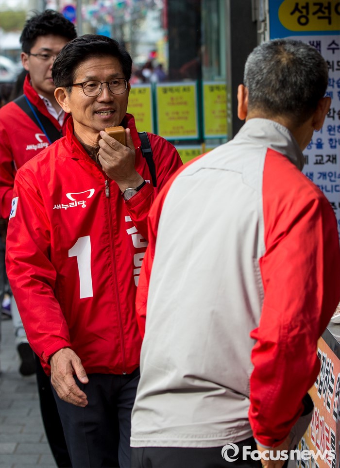 (대구=포커스뉴스) 새누리당 대구 수성구갑 김문수 후보가 31일 오후 대구 수성구 신매시장을 방문해 유권자들에게 한 표를 호소 하고 있다.