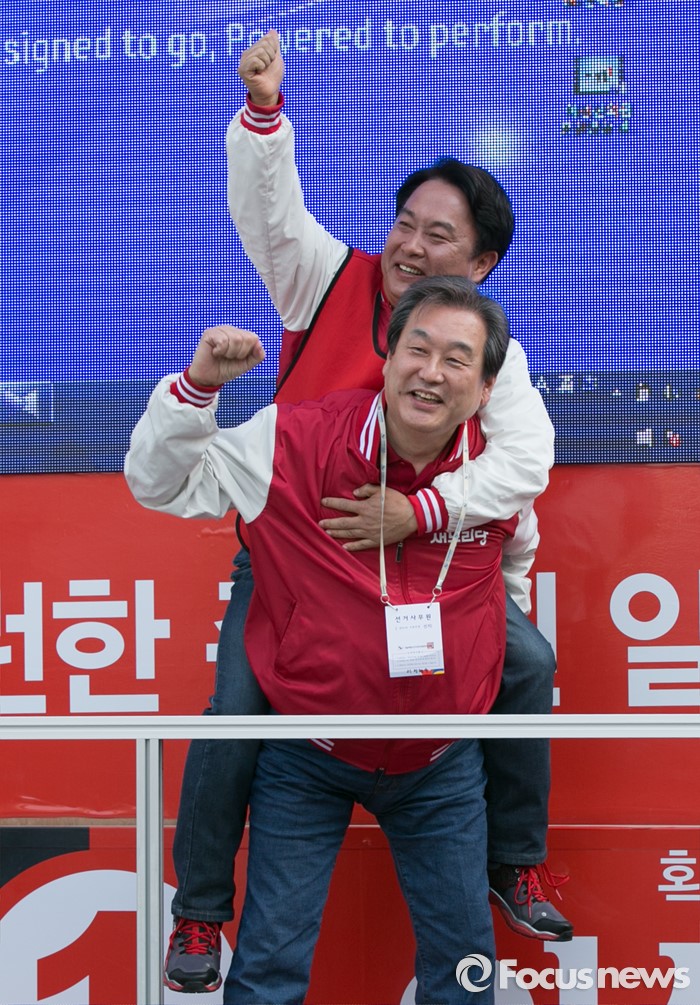 (서울=포커스뉴스) 4.13 총선 공식선거운동이 시작된 31일 오후 서울 서대문구 독립문공원에서 김무성 새누리당 대표가 이성헌 서대문갑 후보 출정식에 참석해, 이 후보를 업고 있다.
