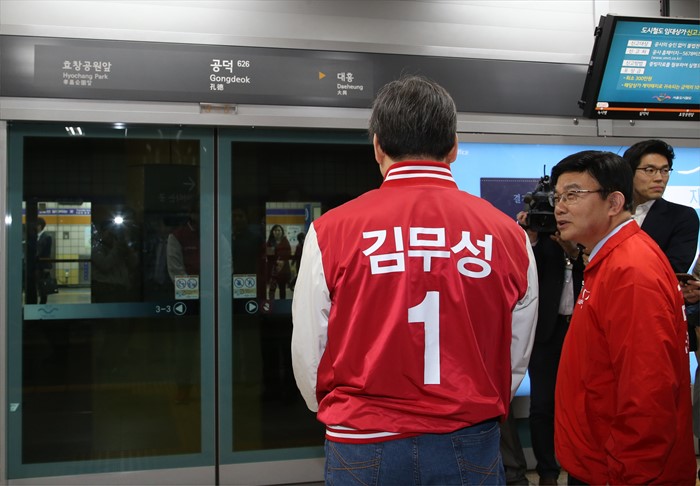 | △ 지하철 열차 기다리는 김무성-김성동 |