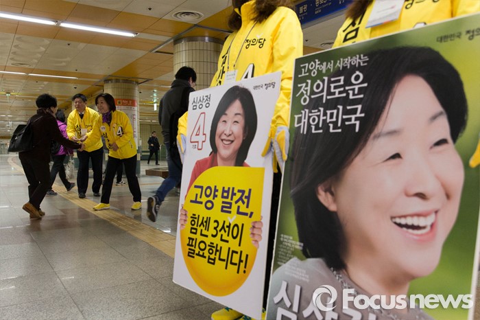 (고양=포커스뉴스) 1일 오전 고양시 덕양구 삼송역에서 심상정 정의당 대표 고양갑 후보가 출근길 선거유세를 하고 있다.