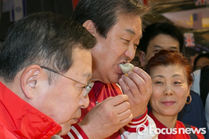 점포를 돌며 지지를 당부하던 김 대표와 안 최고위원은 만두와 팥죽 등 시장 음식도 맛봤다. 반찬가게를 하는 한 상인이 나물을 입에 넣어주자 "맛있습니다"라고 말했다.