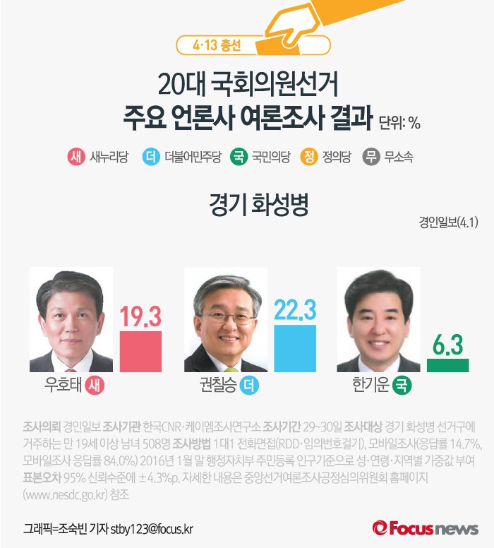 (서울=포커스뉴스) 경인일보가 여론조사 전문기관인 한국 CNR·케이엠조사연구소(주)에 의뢰해 지난달 29~30일 화성병 선거구의 유권자를 대상으로 여론조사를 실시한 결과, 더민주 권칠승 후보가 22.3%, 새누리당 우호태 후보가 19.3%로 오차 범위 내의 치열한 각축전을 벌이고 있는 것으로 나타났다.