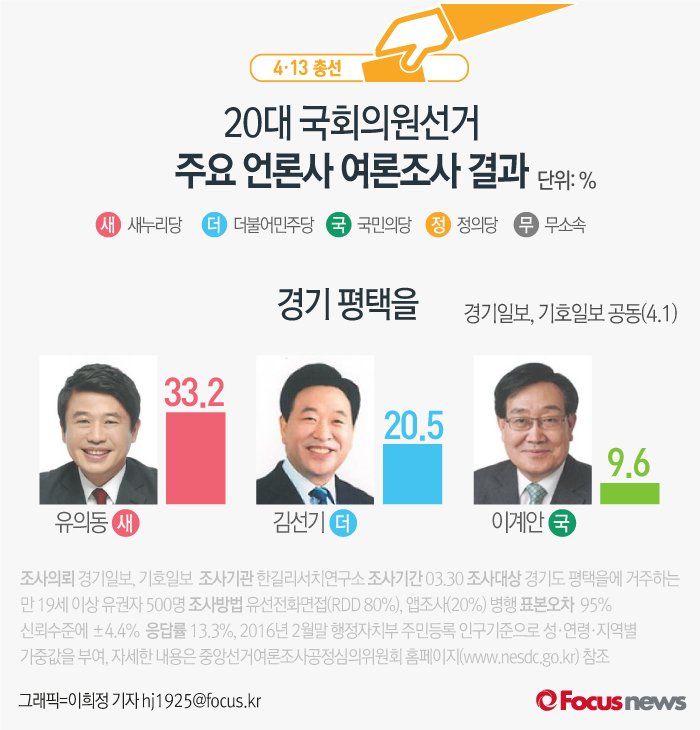 (서울=포커스뉴스) 경기일보, 기호일보가 한길리서치연구소에 의뢰해 1일 발표한 여론조사 결과에 따르면 새누리당 유의동 후보의 지지율은 33.2%, 더불어민주당 김선기 후보의 지지율은 20.5%, 국민의당 이계안 후보는 9.6%를 기록했다.