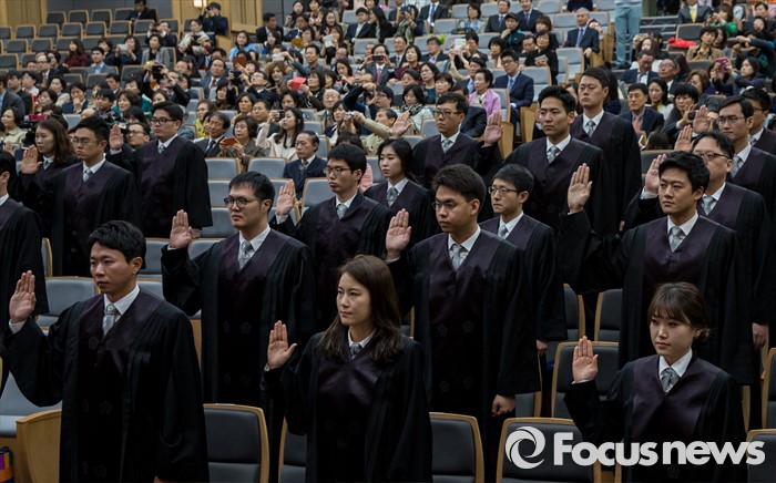 (서울=포커스뉴스) 1일 오전 서울 서초구 대법원 대강당에서 열린 신임 법관 임명식에 참석한 신임 법관들이 선서하고 있다.