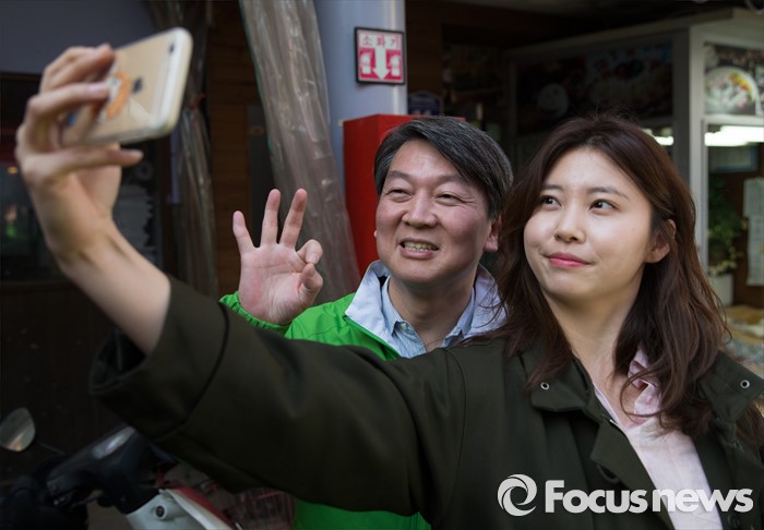 (안양=포커스뉴스) 안철수 국민의당 상임공동대표가 1일 오전 안양시 동안구 중앙시장에서 백종주 동안구갑 후보 지원 유세 중 한 여성과 셀카를 찍고 있다.