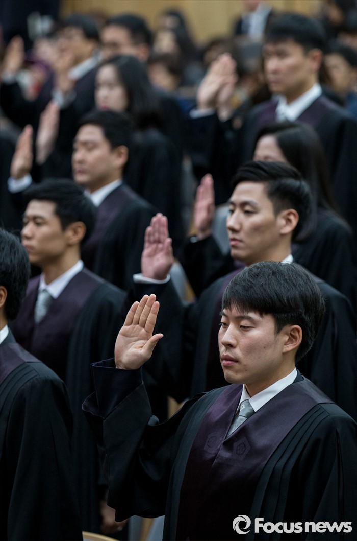 (서울=포커스뉴스) 1일 오전 서울 서초구 대법원 대강당에서 열린 신임 법관 임명식에 참석한 신임 법관들이 선서하고 있다.