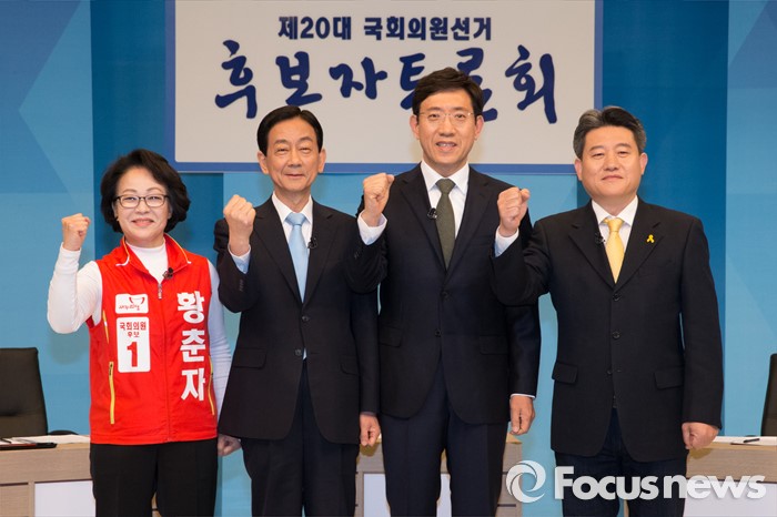 (서울=포커스뉴스) 1일 오전 서울 마포구 서강대 스튜디오에서 제20대 국회의원선거 용산구 후보자들이 지역 케이블 토론회 전 포토타임을 갖고 있다. 왼쪽부터 황춘자 새누리당 후보, 진영 더불어민주당 후보, 곽태원 국민의당 후보, 정연욱 정의당 후보.