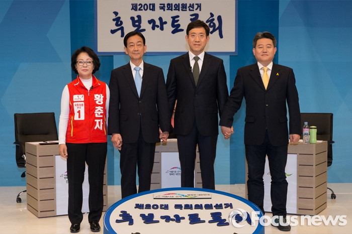 (서울=포커스뉴스) 1일 오전 서울 마포구 서강대 스튜디오에서 제20대 국회의원선거 용산구 후보자들이 지역 케이블 토론회 전 포토타임을 갖고 있다. 왼쪽부터 황춘자 새누리당 후보, 진영 더불어민주당 후보, 곽태원 국민의당 후보, 정연욱 정의당 후보.