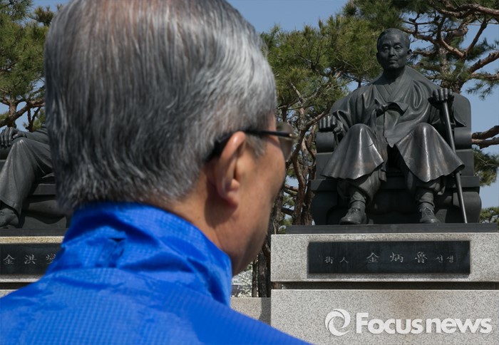(전주=포커스뉴스) 1일 오전 전북 전주시 덕진공원을 방문한 김종인 더불어민주당 비대위 대표 겸 선대위원장이 김 대표의 조부인 가인 김병로 선생 등 '법조 3성' 동상을 바라보고 있다.