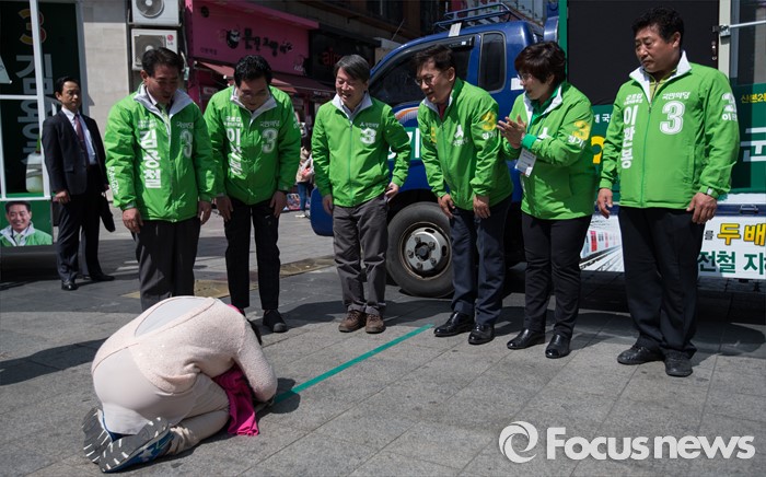 (군포=포커스뉴스) 안철수 국민의당 상임공동대표와 국민의당 후보들이 1일 오전 경기 군포시 산본로데오거리 원형광장에서 정기남 군포시을 후보 지원 유세 중 한 여성 지지자에게 큰절을 받고 있다.