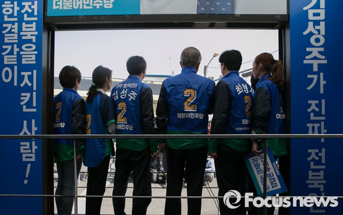 (전주=포커스뉴스) 1일 오전 전북 전주 모래내시장 입구에서 열린 더불어민주당 최형재 전주을, 김성주 전주병 후보 유세에 참여한 김종인 비대위 대표 겸 선대위원장이 지지를 호소하고 있다.