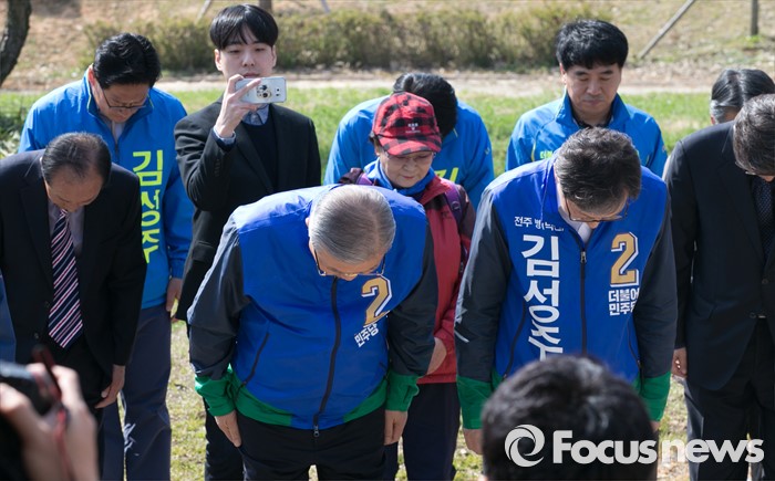 (전주=포커스뉴스) 1일 오전 전북 전주시 덕진공원을 방문한 김종인(왼쪽) 더불어민주당 비대위 대표 겸 선대위원장과 김성주 전주병 후보가 김 대표의 조부인 가인 김병로 선생 등 '법조 3성' 동상 앞에서 허리 숙여 인사하고 있다.