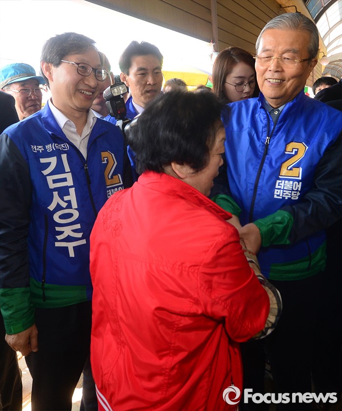 (전주=포커스뉴스) 1일 오전 전북 전주 모래내시장을 방문한 김종인 더불어민주당 비대위 대표 겸 선대위원장과 김성주 전주병 후보가 상인들과 인사하며 지지를 호소하고 있다.