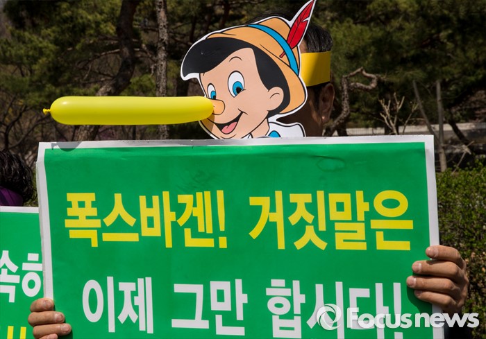 (서울=포커스뉴스) 1일 오전 서울 서초구 서울중앙지법에서 피노키오 탈을 쓴 서민민생대책위원회, 서울환경연합 회원들이 '아우디ㆍ폭스바겐 규탄 및 피해보상 촉구' 기자회견을 열고 있다.