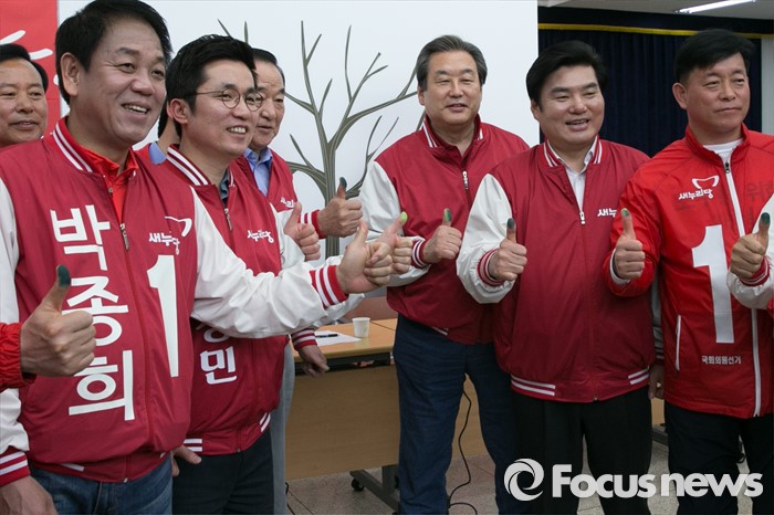 (수원=포커스뉴스) 김무성(오른쪽 세번째) 새누리당 대표와 원유철(오른쪽 두번째) 원내대표, 서청원(오른쪽 네번째) 최고위원이 1일 오전 경기도 수원시 장안구 정조로 새누리당 경기도당에서 열린 중앙선대위 회의에 참석해, 총선 필승나무 지문찍기 전, 포즈를 취하고 있다.