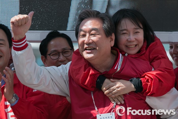 (수원=포커스뉴스) 1일 오전 경기도 수원시 팔달구 수원역 로데오거리 입구에서 열린 새누리당 수원지역 후보자 합동 유세에 참석한 김무성 새누리당 대표가 정미경 수원무 후보를 업고 있다.