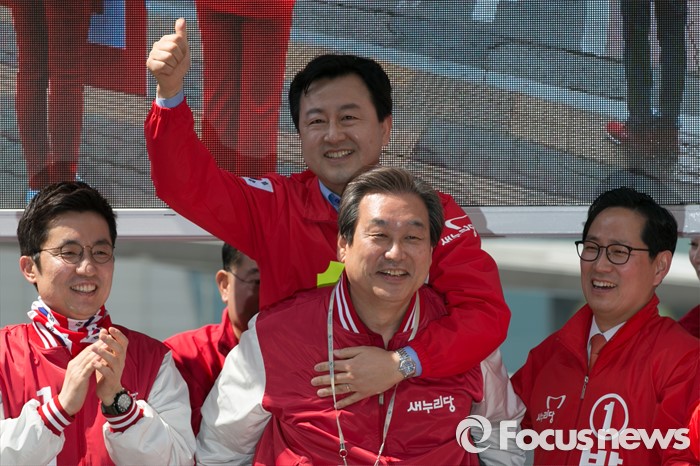 (수원=포커스뉴스) 1일 오전 경기도 수원시 팔달구 수원역 로데오거리 입구에서 열린 새누리당 수원지역 후보자 합동 유세에 참석한 김무성 새누리당 대표가 김용남 수원병 후보를 업고 있다.