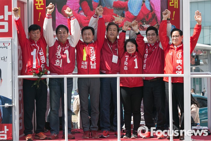 (수원=포커스뉴스) 1일 오전 경기도 수원시 팔달구 수원역 로데오거리 입구에서 김무성(가운데) 새누리당 대표가 수원지역 후보자 합동 유세에 참석해, 후보들과 손을 들고 있다.
